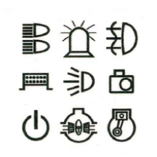 High Quality Hard Wearing Vinyl Labels for interior switches 9 Popular Symbols are included: Driving Lights Beacon Fog Lights Light Bar Work Lights Camera Power Symbol Diff Lock Compressor