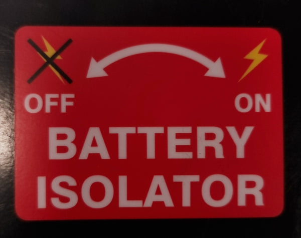 Battery Isolator off on sticker 70 x 50mm - $2.90 AUD